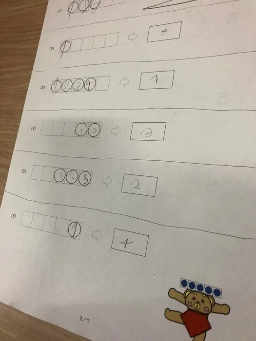 後いくつで5になるかの問いに一個ずつ数字を書いて答えています。