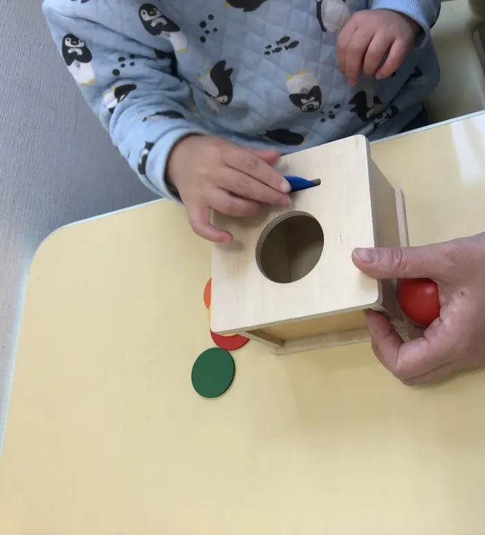 「ぽっとん落とし」の主なねらいは、「手・指先の器用さを高める」「目と手の協応動作を養う」「集中力と観察力を育む」ことです。物を穴に落とす動作を通じて、手首のコントロールや物の形・向きを考える力が身につき、落ちた時にも音がして達成感も得られます。