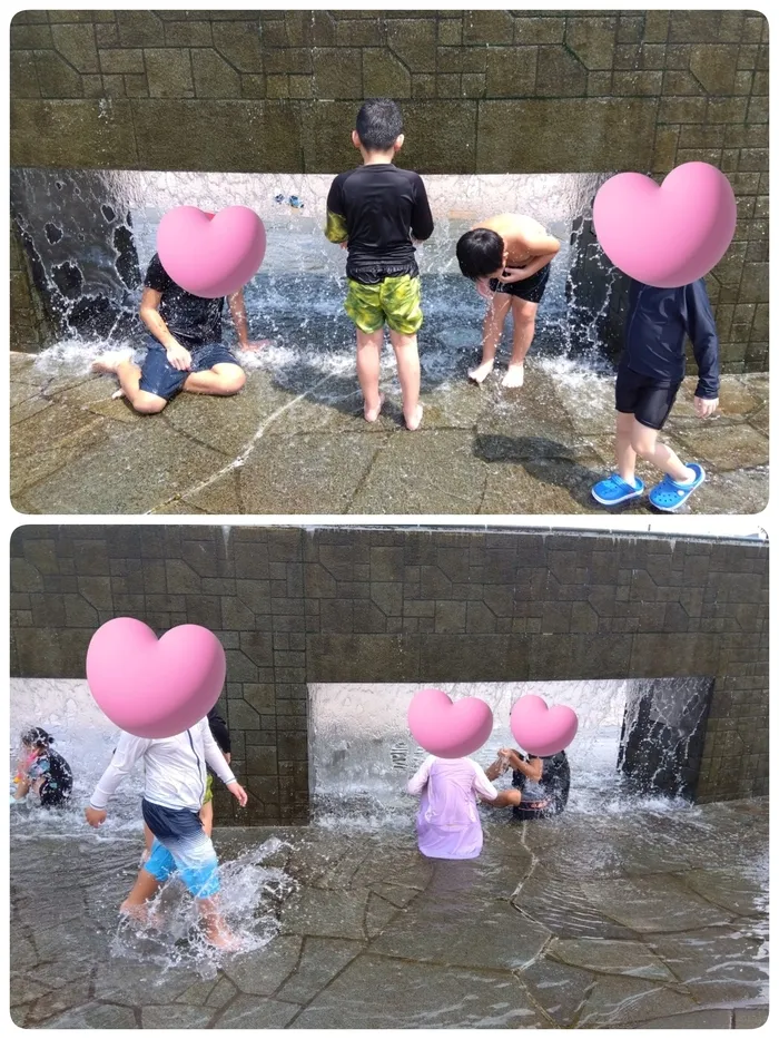 カーテンのようなシャワーを体に浴びてお子さん達は涼んでいました。