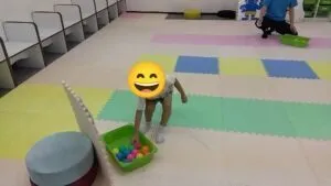 子ども達は鬼のイラストの前にあるカゴから、自分の陣地にボールを移す事で鬼の“体力を削る”ことを表現しました。制限時間は 1人10秒 ⏱!スタート地点からボールを運び、みんなで力を合わせて鬼の体力を削っていきます。