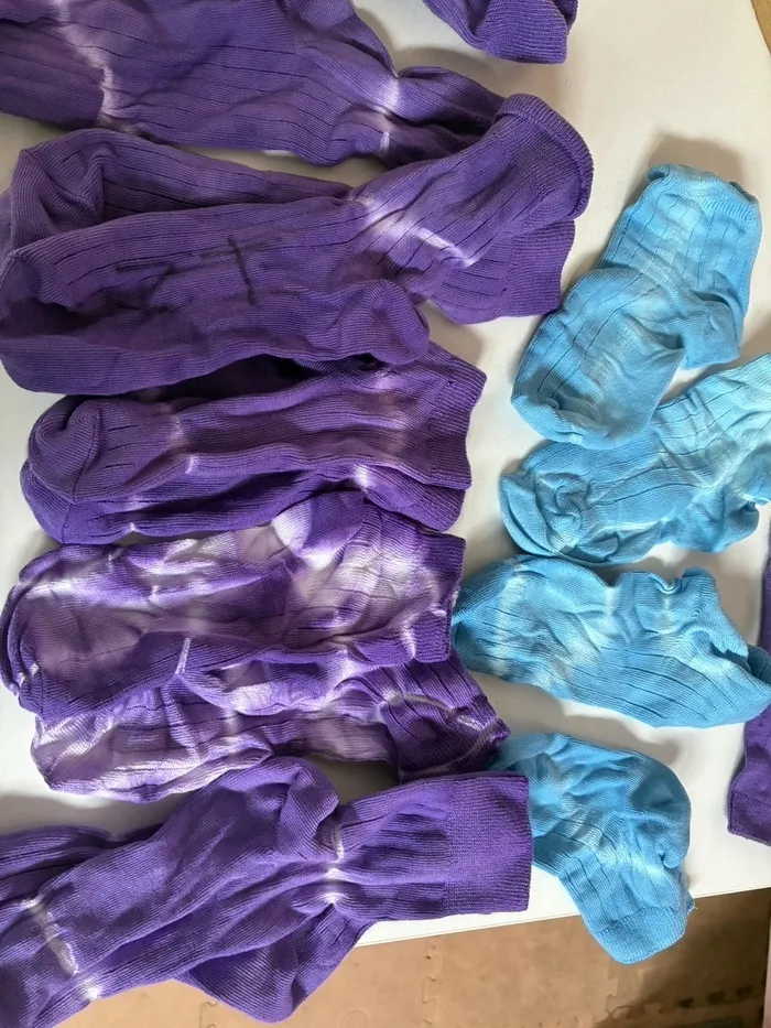靴下に模様をつけるため、好きな所に輪ゴムを止めて染めていき。